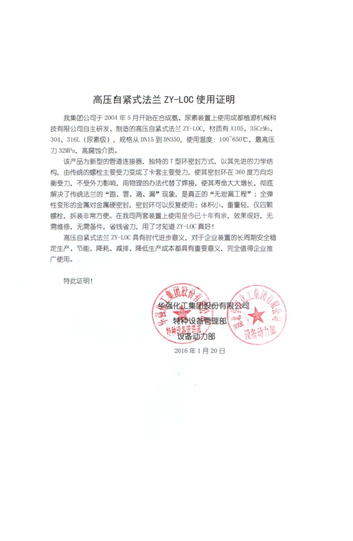 華強化工集團股份有限公司使用證明